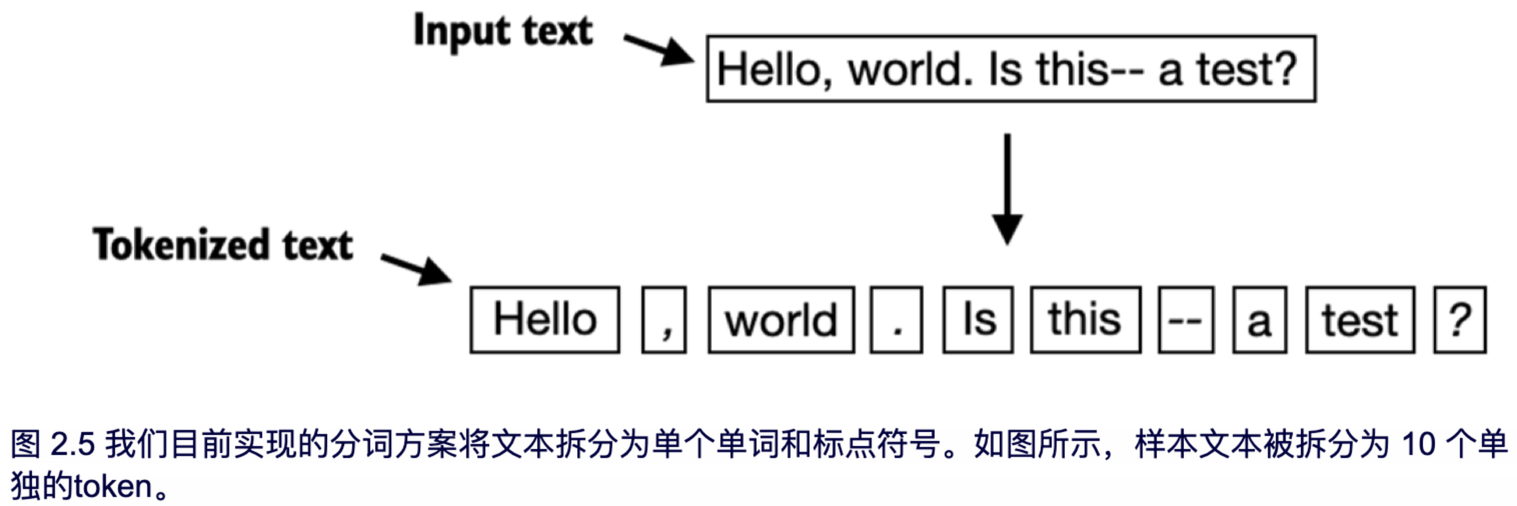 本节将讨论如何将输入文本拆分为单个token,这是创建 LLM 嵌入所需的预处理步骤。这些token可以是单个单词或特殊字符,包括标点符号,具体如图 2.4 所示。