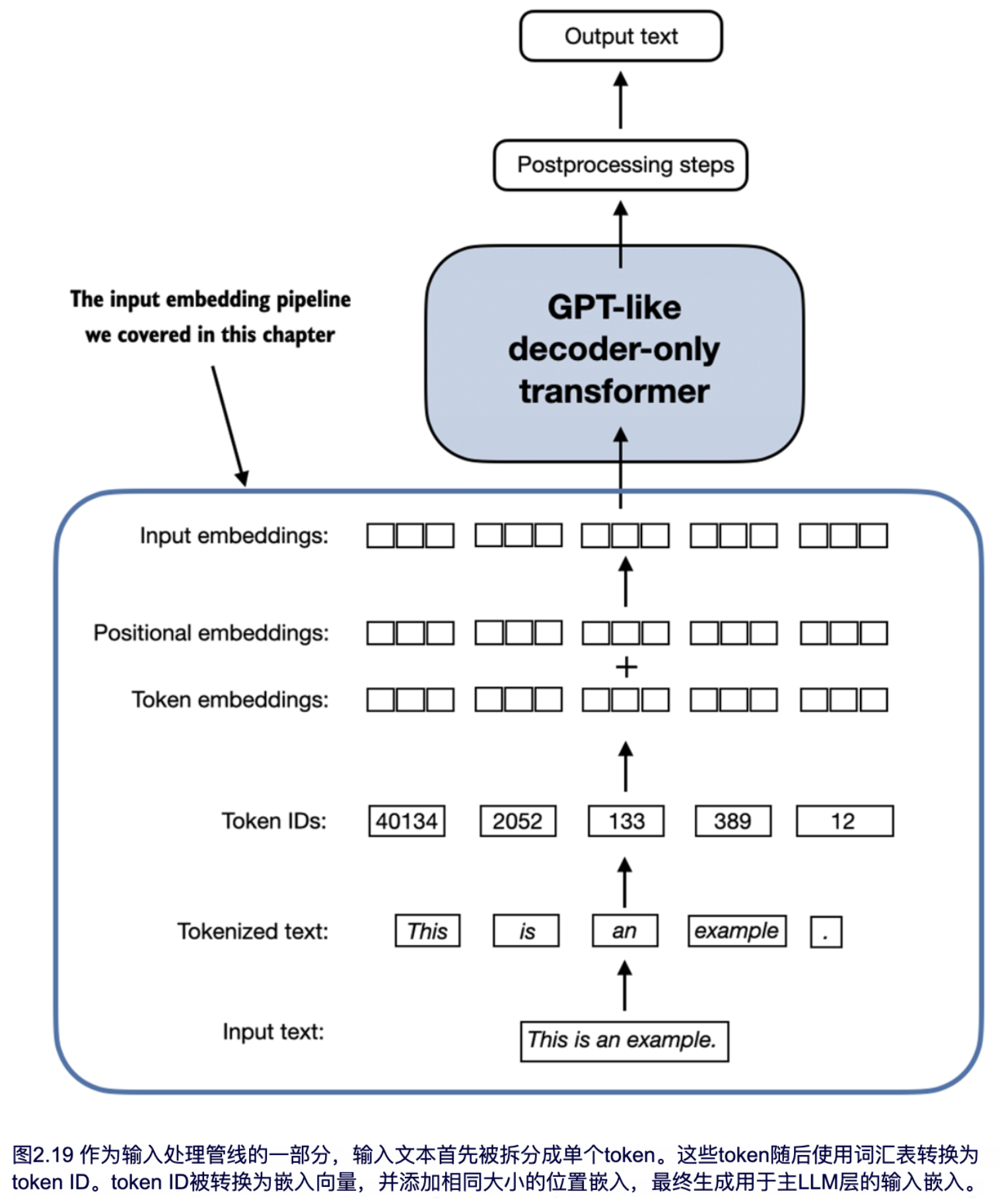 我们创建的 input_embeddings,如图 2.19 所示,现在可作为LLM的核心模块的输入嵌入。我们将在第3章开始实现这些模块。