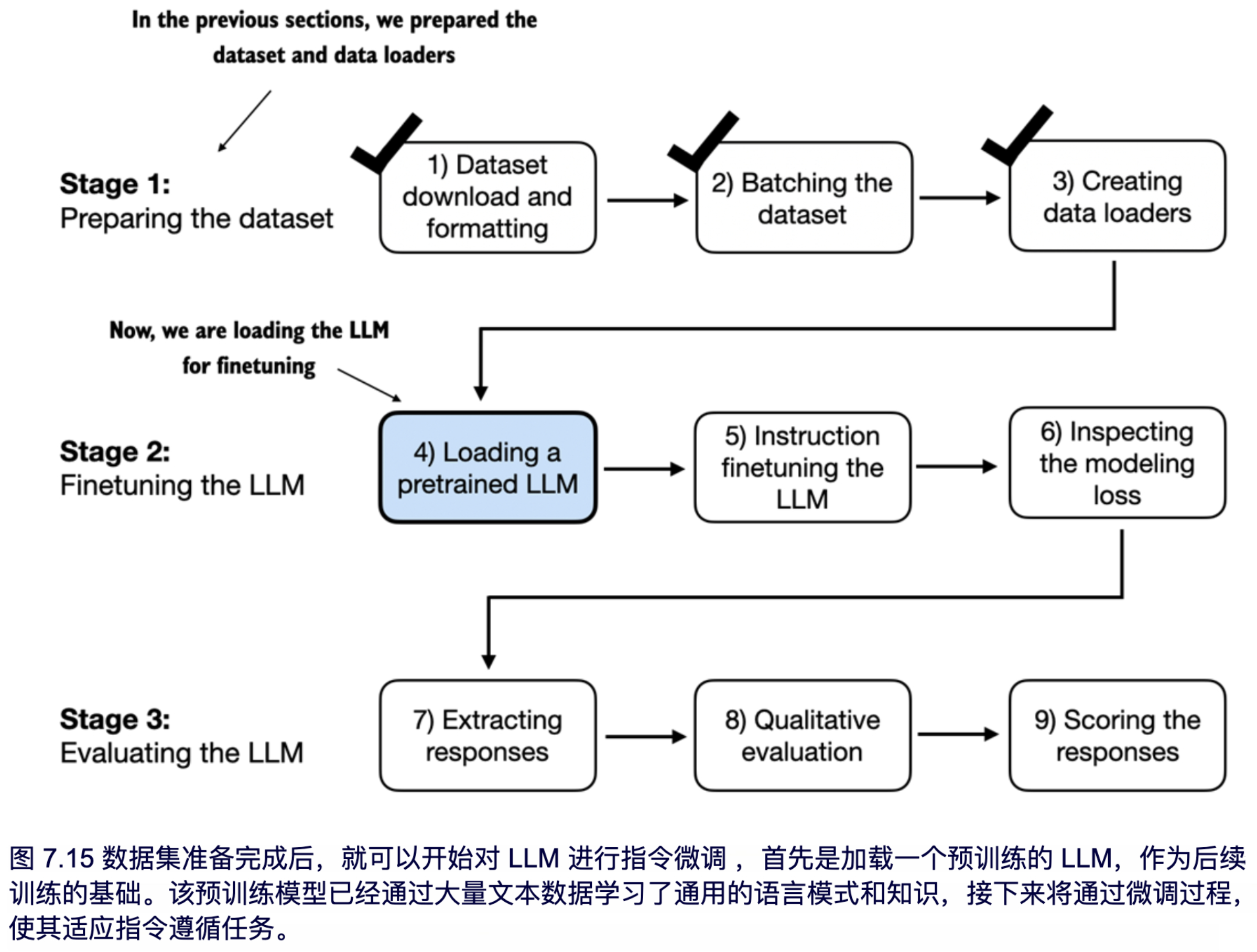在本章的剩余部分,我们将逐步实现指令微调过程,首先从数据集准备开始,如图 7.3 所示。