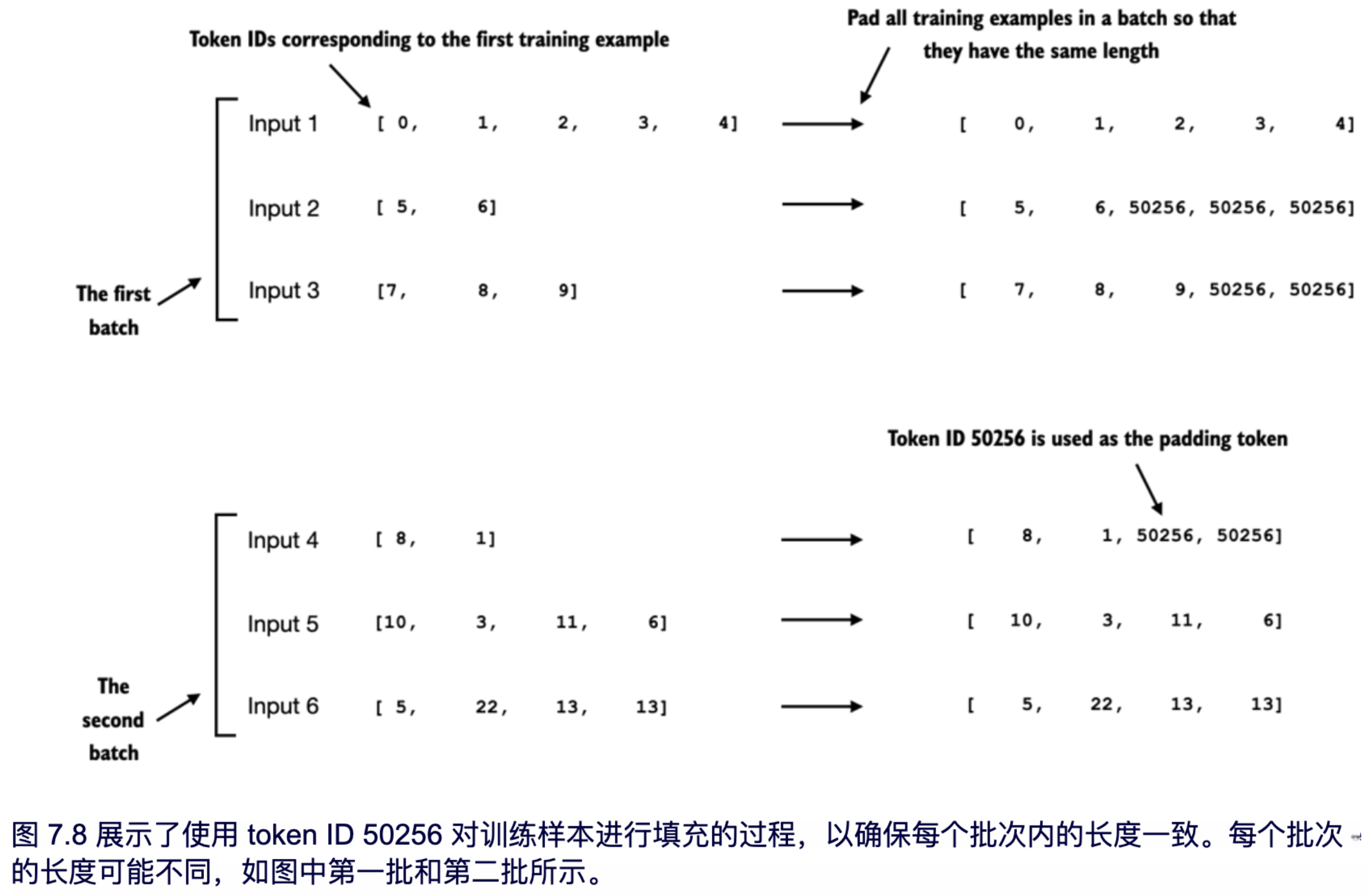 collate函数用于构建训练批次,处理过程包括对序列数据进行填充,生成目标 token 的 ID,并对填充的 token 进行掩码处理。 - 我们加载了一个具有 3.55 亿参数的预训练 GPT-2 medium 模型,作为指令微调的起点。
