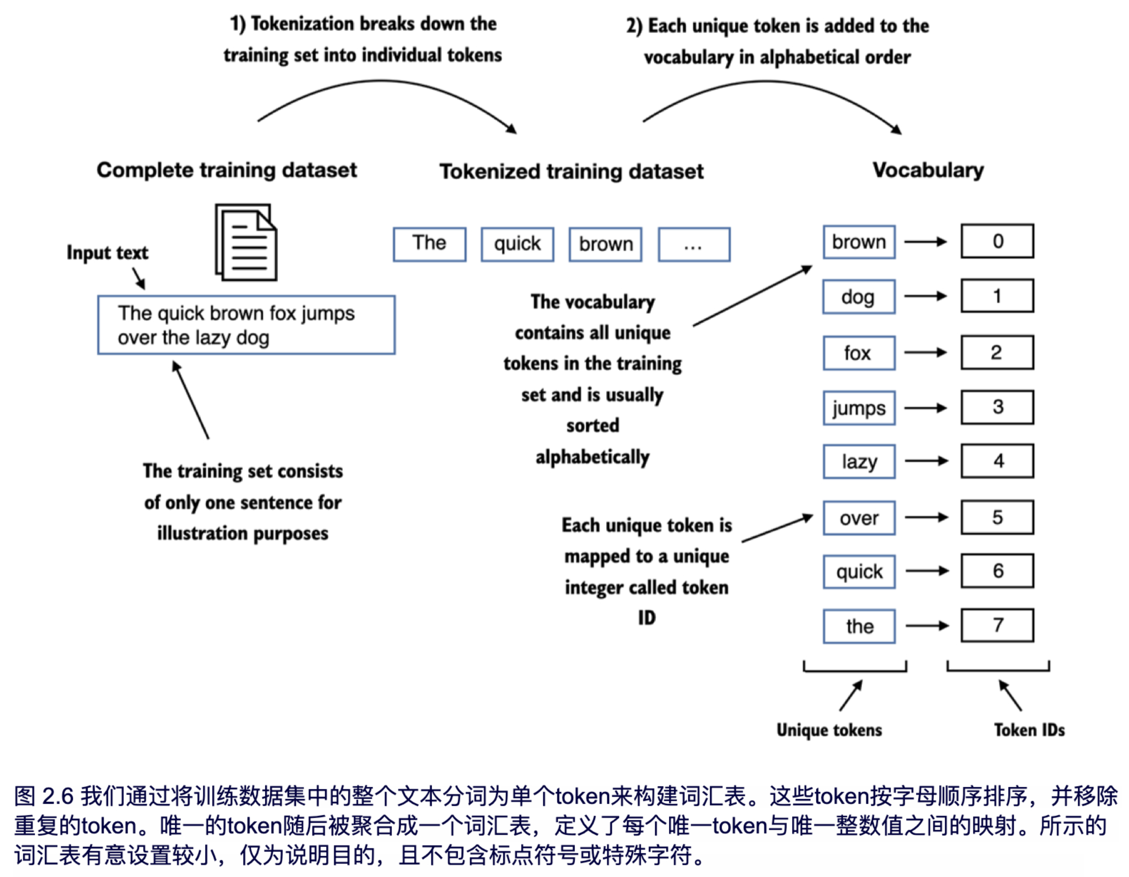 为了将先前生成的token映射到token ID,我们首先需要构建一个词汇表。这个词汇表定义了每个独特单词和特殊字符与唯一整数的映射,如图 2.6 所示。