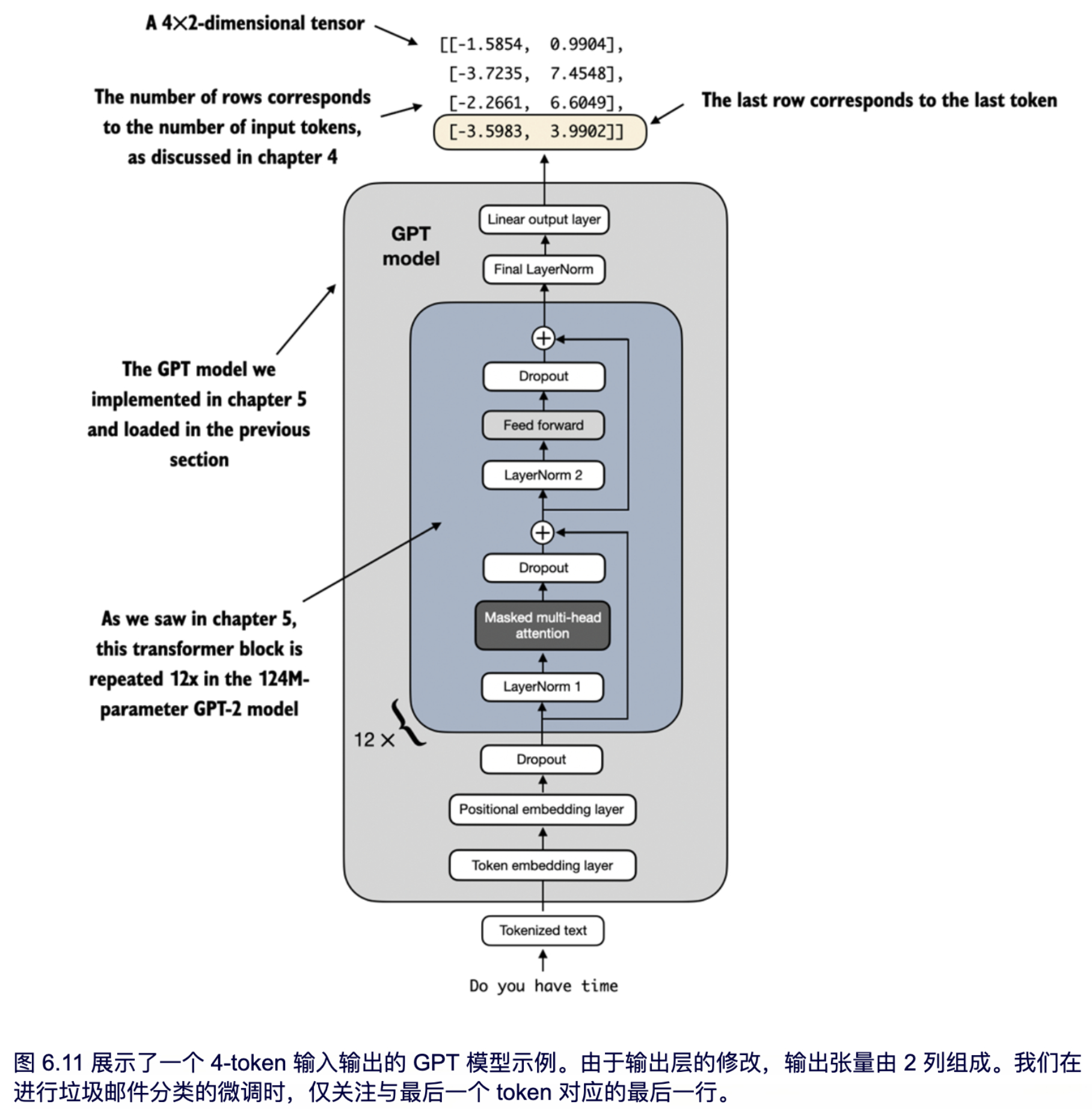 • 在将文本消息分类为‘垃圾短信’或‘非垃圾短信’的任务中,新的分类层只需要 2 个输出节点;而在之前的章节中,输出节点的数量等于词汇表中的唯一 token 数量,即 50,256。