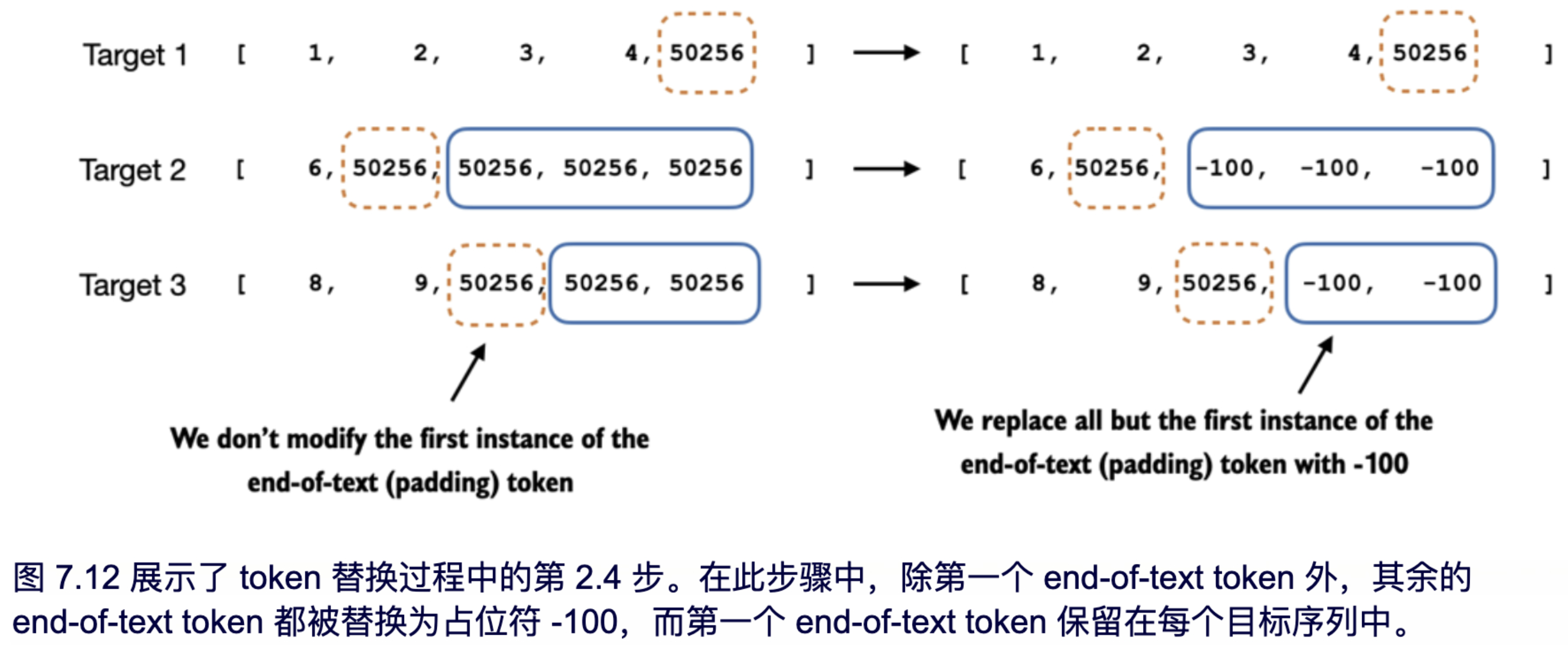 • 自定义的collate函数用于构建训练批次,处理过程包括对序列数据进行填充,生成目标 token 的 ID并对填充的 token 进行掩码处理。
