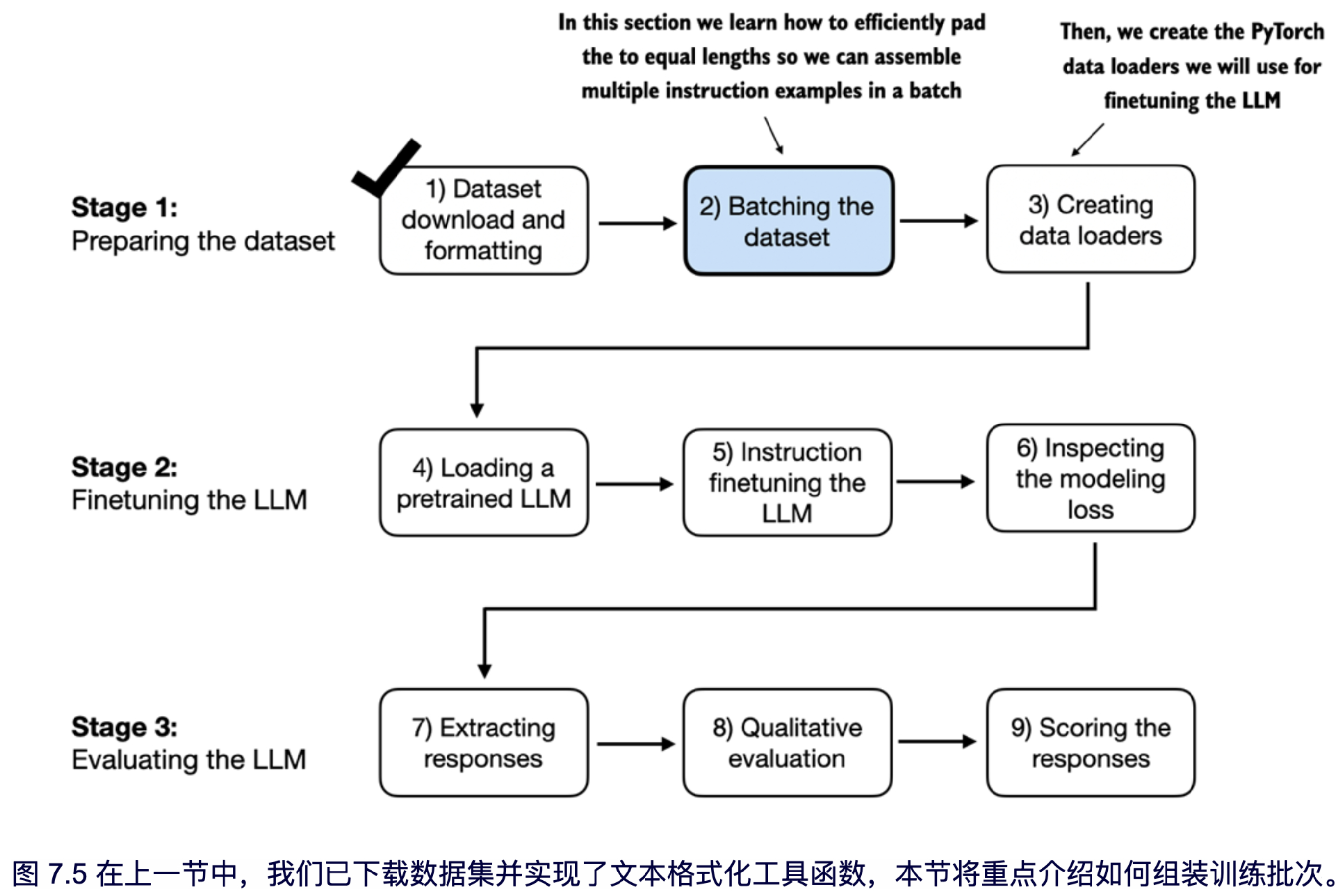 在本章的剩余部分,我们将逐步实现指令微调过程,首先从数据集准备开始,如图 7.3 所示。