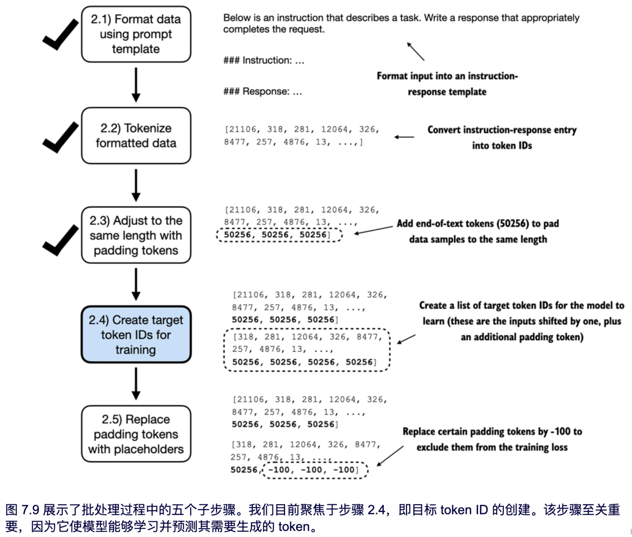 collate函数用于构建训练批次,处理过程包括对序列数据进行填充,生成目标 token 的 ID,并对填充的 token 进行掩码处理。 - 我们加载了一个具有 3.55 亿参数的预训练 GPT-2 medium 模型,作为指令微调的起点。