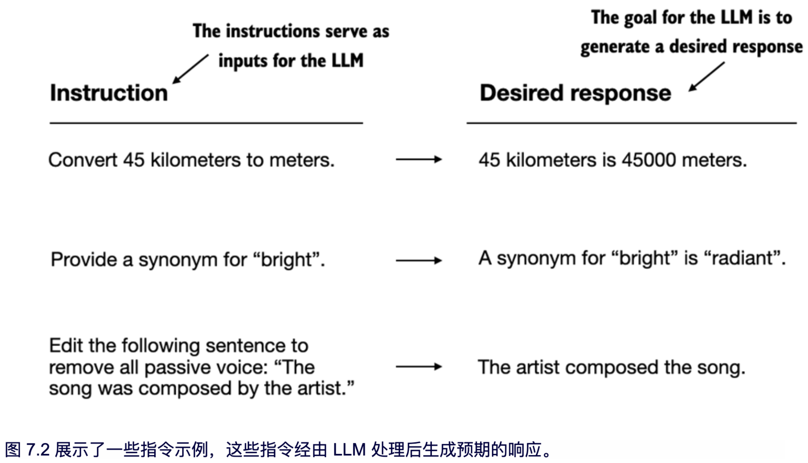 本章将专注于提升 LLM 遵循指令并生成理想回答的能力,如图 7.2 所示。