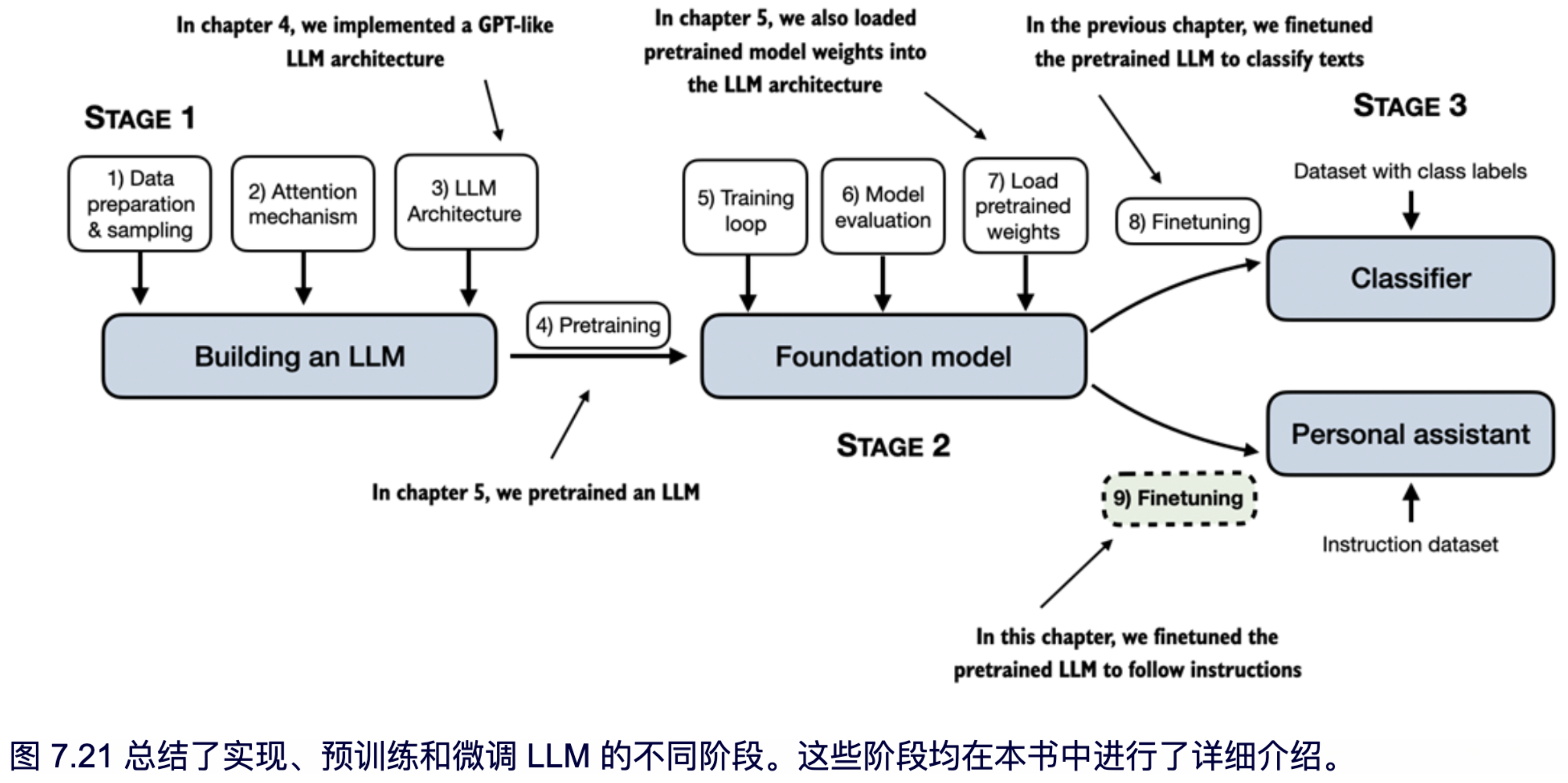 本章总结了大语言模型(LLM)开发流程的关键步骤,包括实现 LLM 架构、预训练模型以及针对特定任务的微调,具体内容可参考图 7.21。