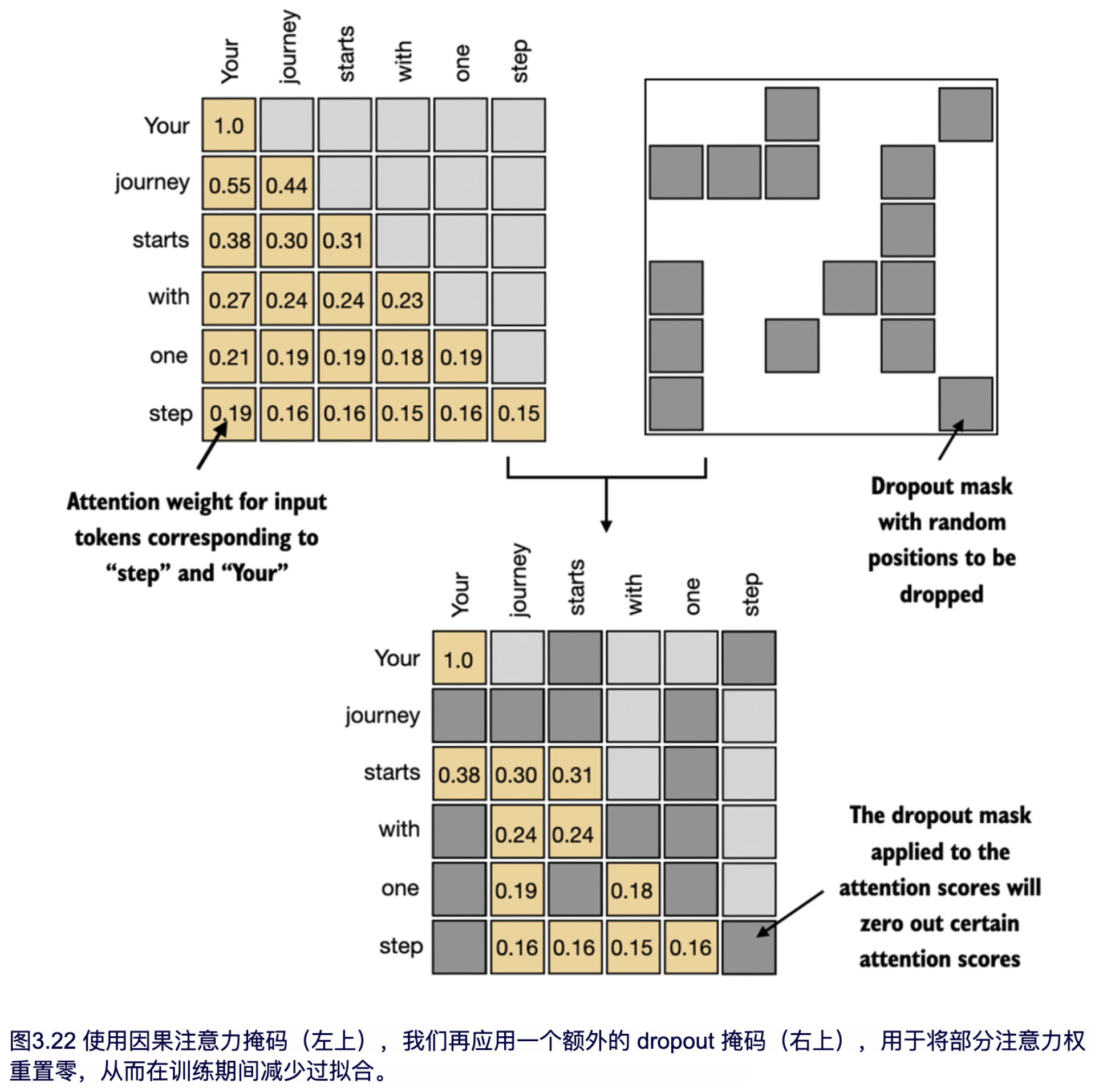 • 除了通过因果注意力掩码将注意力权重置为零之外,我们还可以添加 dropout 掩码,以减少 LLM 中的过拟合现象。