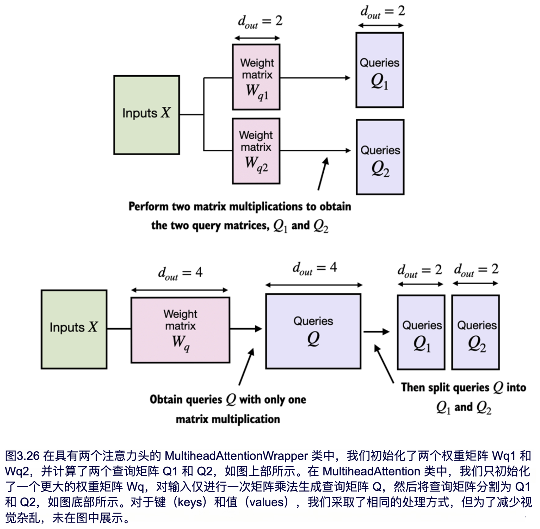 从宏观层面上看,在之前的 MultiHeadAttentionWrapper 中,我们通过堆叠多个单头注意力层的方式来组合成一个多头注意力层。而 MultiHeadAttention 类采用了一种集成的方法:它从一个多头注意力层开始,并在内部将该层分解为各个独立的注意力头,如图 3.26 所示。