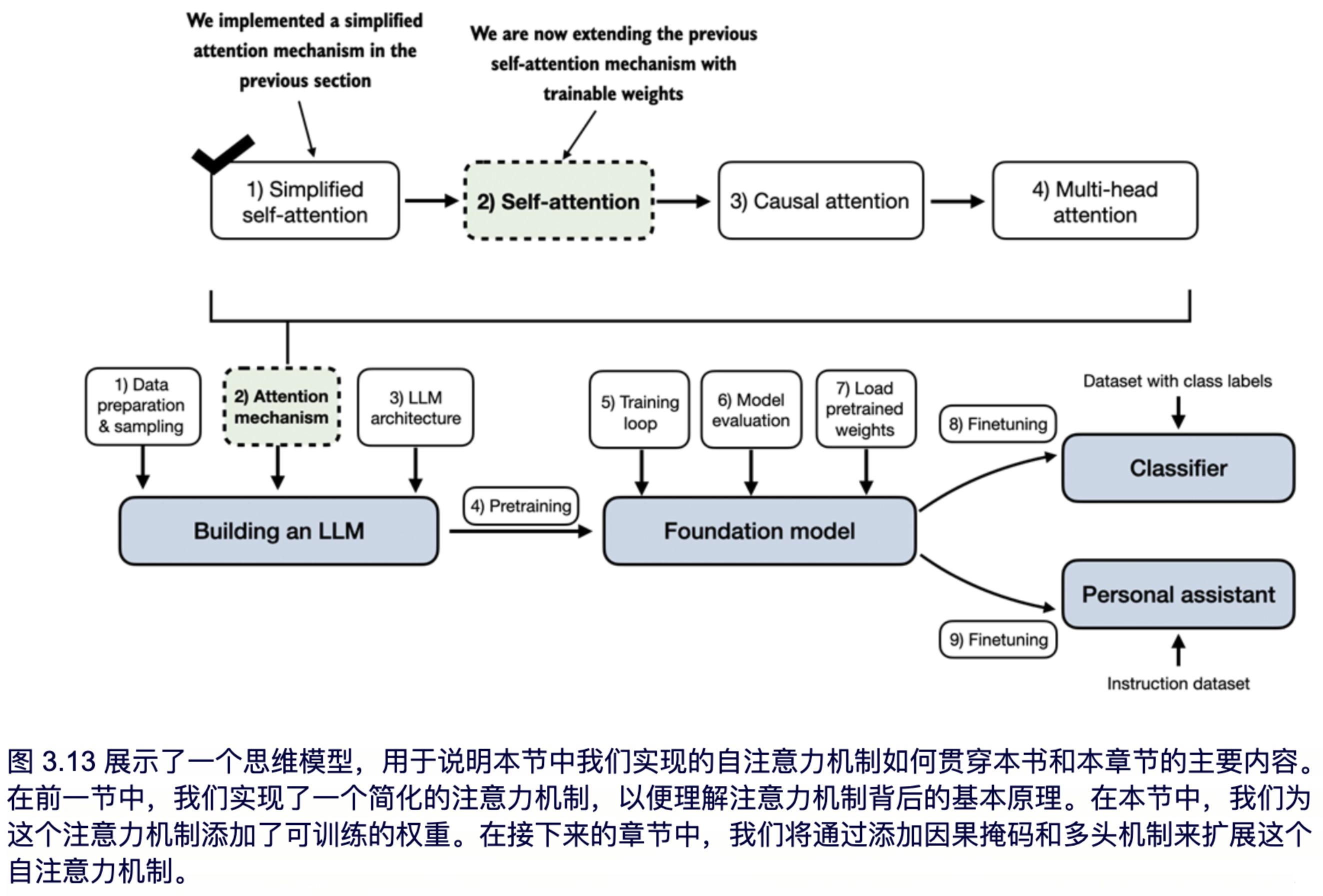 本章将重点讲解并实现 GPT 类模型中使用的自注意力机制,如图 3.6 所示。在下一章中,我们将继续编码 LLM 的其它部分。
