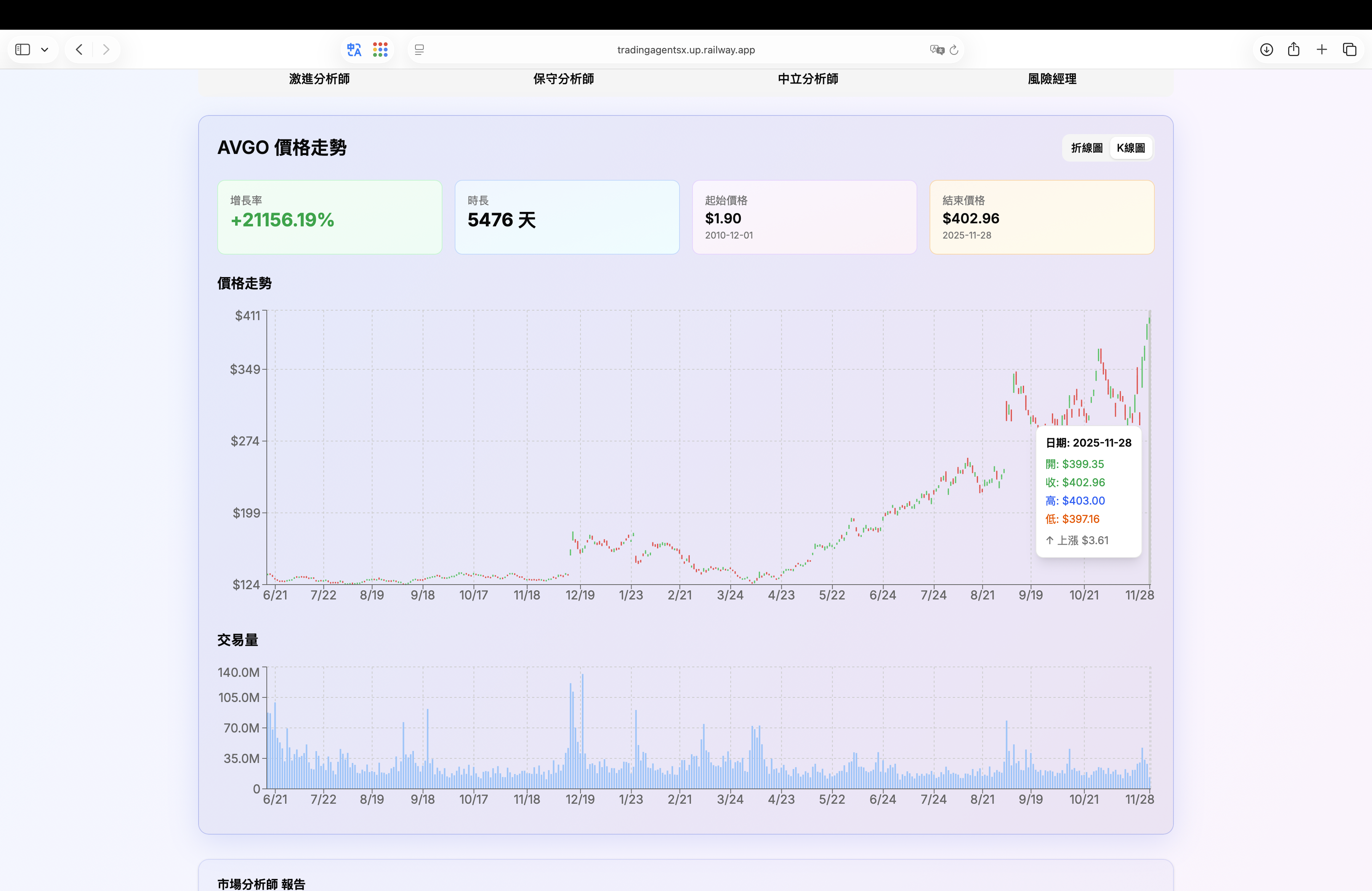 互動式價格走勢與成交量圖表(K 線圖),清晰呈現股票歷史數據